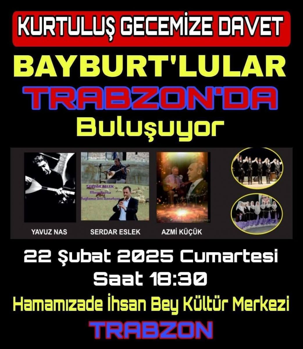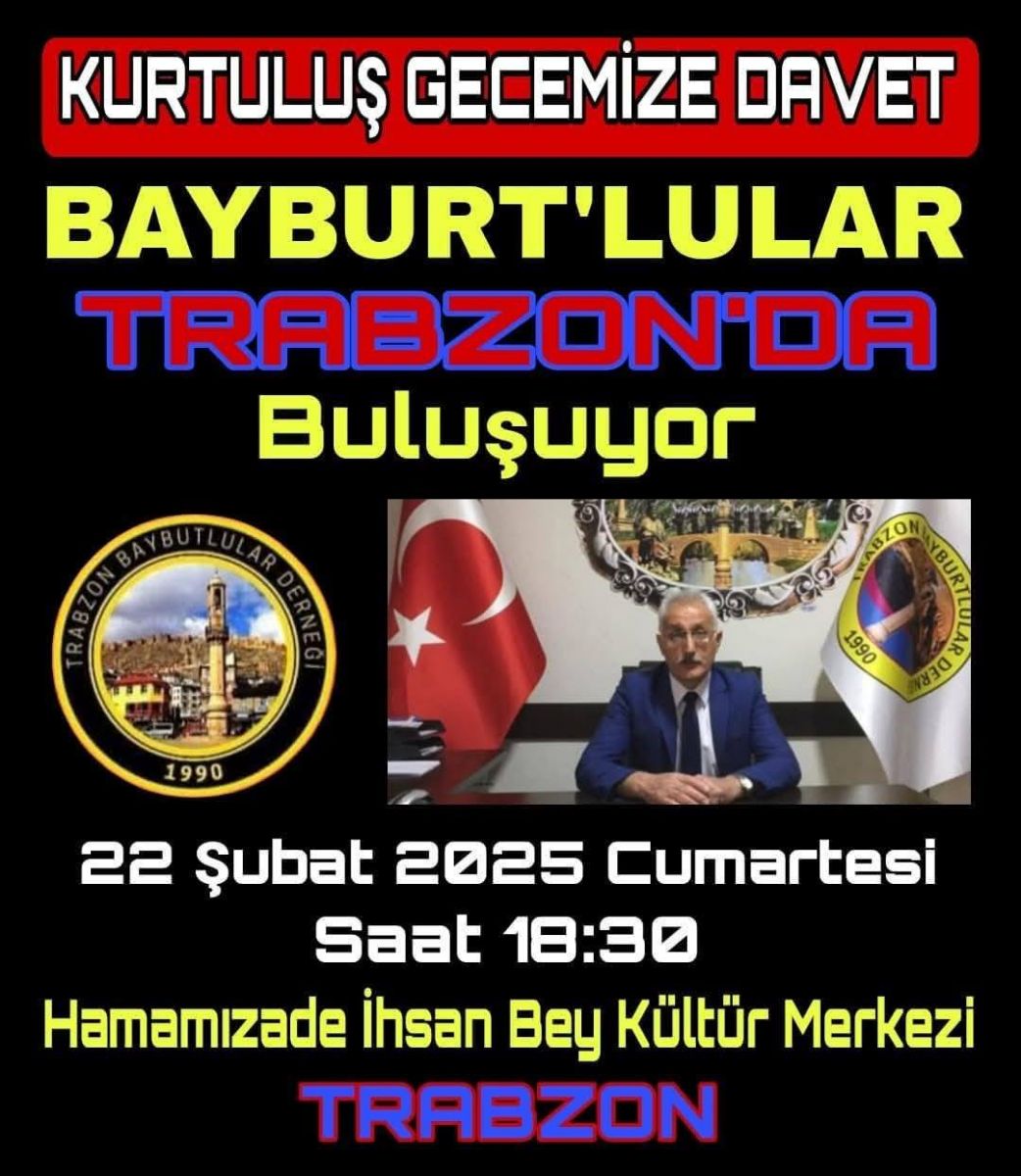 Trabzon Bayburtlular Derneği, “Bayburtlular Trabzon’da Buluşuyor” sloganı ile 22 Şubat 2025 Cumartesi günü saat 18.30’da Trabzon Hamamizade İhsanbey Kültür Merkezinde Bayburt'un Düşman işgalinden Kurtuluşunun 107. yıldönümü dolayısıyla Kurtuluş gecesi düzenleyecek.